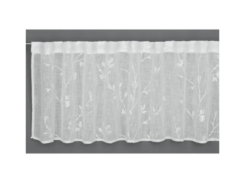 Zeitloses Design für ihr Fenster – die Bistrogardine Stickerei in einem natürlichen Weiß mit Blumenstickerei. Der transparente Stoff umschmeichelt sanft das Fenster und deckt ab ohne zu verdunkeln oder die Sicht vollständig zu nehmen. Die florale Stickerei macht die Gardine zu einem kleinen Highlight an Ihrem Fenster.