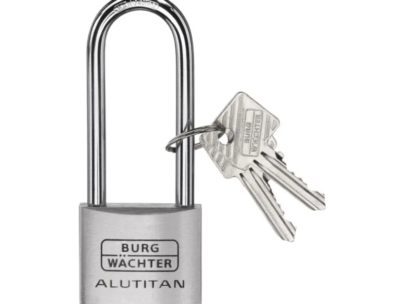 Das praktische und robuste Burg-Wächter Zylinder-Vorhangschloss Alutitan 770 HB 40 65 SB ist ausgestattet mit einem massiven Aluminiumkörper. Dieser bietet einen guten Aufbruchschutz und schützt zusätzlich das Innenwerk zuverlässig vor Feuchtigkeit und somit auch vor Rost. Der Bügel des 770 ALUTITAN ist stahlhart und doppelt verriegelt.
