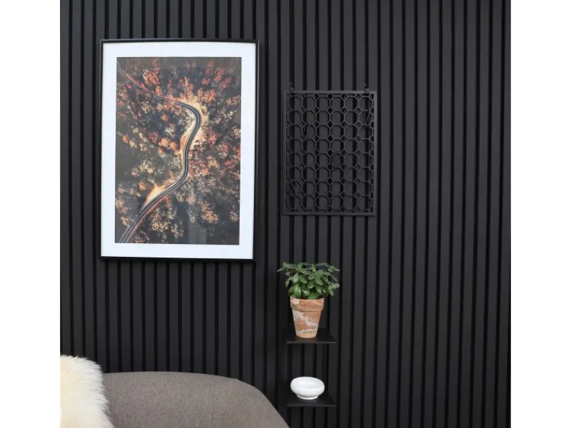 Die Montage ist unkompliziert: Vorgebohrte Löcher und mitgelieferte Schrauben ermöglichen eine schnelle und sichere Befestigung – sowohl an vertikal als auch horizontal montierten Akustikpaneelen. Gefertigt aus pulverbeschichtetem Stahl in mattem Schwarz ist das Regal robust, langlebig und ästhetisch zugleich.