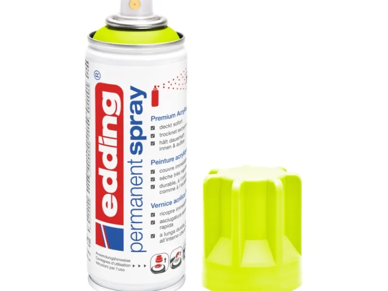 Der edding Acryllack wird mit zwei Sprühköpfen ausgeliefert. Der Standard-Sprühkopf hat eine Sprühbreite von ca. 5-6 cm, Wechselsprühköpfe sind in den Sprühbreiten fein (ca. 1 cm), medium (ca. 4-5 cm), breit (ca. 8-10 cm) und variabel (ca. 13-14 cm) erhältlich.