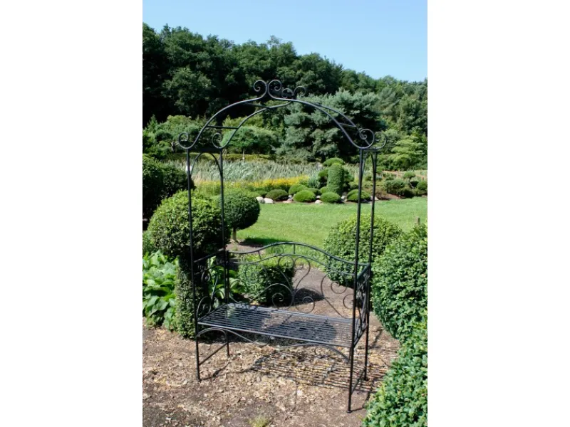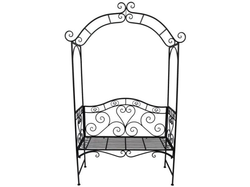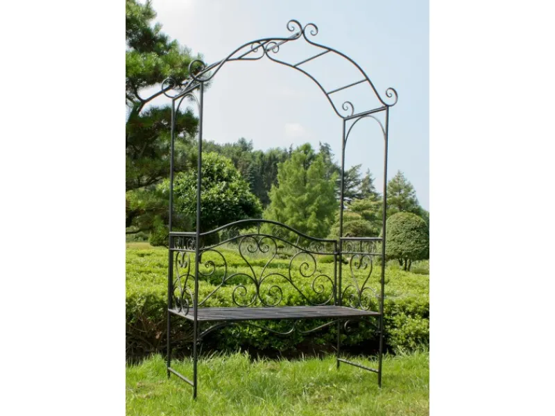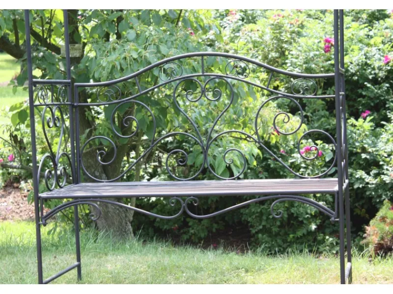 Der Rosenbogen ist nicht nur funktional, sondern auch ästhetisch ansprechend gestaltet. Spielerische Bögen aus Stahl zieren die aufwändig gestaltete Rückenlehne und die Seitenteile des Bogens, was ihm ein elegantes und dekoratives Aussehen verleiht.