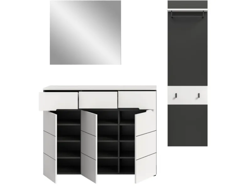 Mit dem 3-teiligen Garderoben Set „Cooper“ gönnen Sie sich ein Höchstmaß an Funktionalität und Eleganz in Ihrem Flur! Die Ausstattung des Sets umfasst eine geräumige Schuhkommode, ein schmales Garderobenpaneel und einen eleganten Spiegel. Mit drei Türen, drei Schubkästen mit Vollauszug und 12 geschlossenen Fächern bietet die Garderobe viel Stauraum für Ihre Schuhe. Die durchdachte Ausstattung beinhaltet zudem vier Kleiderhaken, eine Kleiderstange und eine Hutablage. Front und Oberböden in schlichtem weiß verleihen dem Set einen modernen Look, während der Korpus und die Absetzungen in Basalt grau für einen stimmigen Kontrast sorgen. Dank Soft-Close Funktion und grifflosem Front-Design überzeugt die 3-teilige Garderobe nicht nur durch ihr Äußeres. Mit den Maßen von ca. 180 x 190 x 37 cm bietet „Cooper“ Platz für all Ihre Anforderungen.