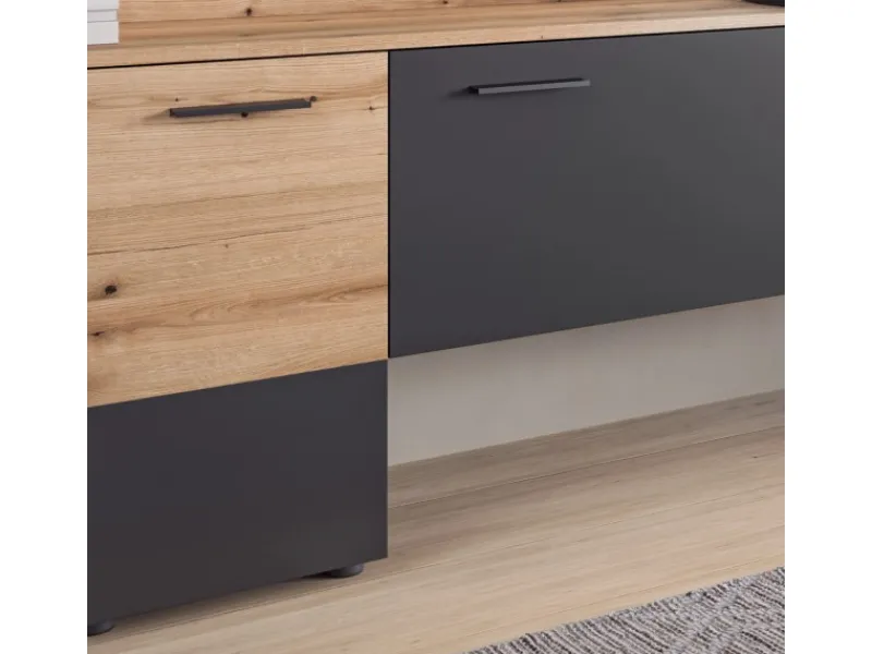 Die Wohnwand „Elian“ von Inn.Furn ist die perfekte Kombination aus modernem Design und praktischer Funktion. Mit ihrer eleganten Mischung aus grauem Melamin und Akzenten in Evoke Eiche verleiht sie jedem Raum eine stilvolle Note. Die dreiteilige Wohnkombination bietet großzügigen Stauraum für alle Bedürfnisse, inklusive Soft-Close-Systemen für geräuschloses Schließen. Die integrierte LED-Rückwandbeleuchtung schafft ein gemütliches Ambiente in Ihrem Wohnzimmer, während das TV-Lowboard Platz für Geräte bis zu 65″ bietet.