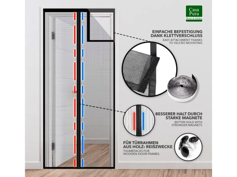 „Johnny“ und „Sam“ sind in verschiedenen Größen erhältlich. Somit wird sichergestellt, dass Sie für jede Türöffnung die passende Variante finden. Leicht, reißfest, schnell anzubringen und sorgfältig verarbeitet: Die Fliegengitter freuen sich darauf, auch Ihr Zuhause sicher vor Insekten zu schützen sowie Ihnen zeitgleich den Genuss einer frischen Brise nicht zu verwehren.