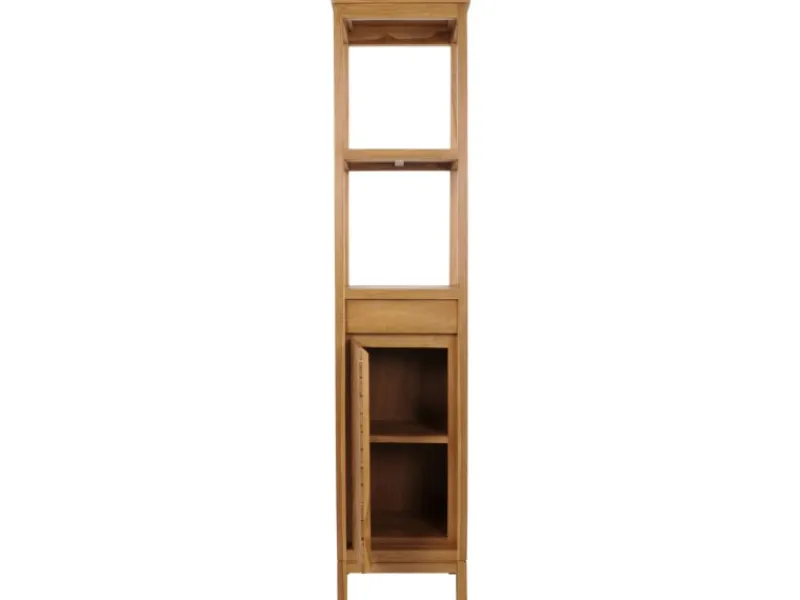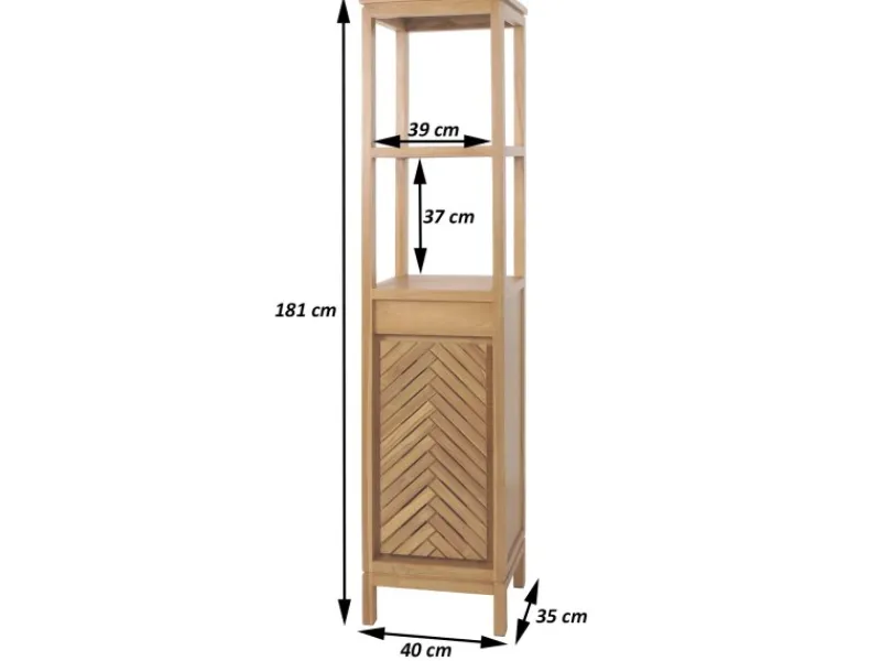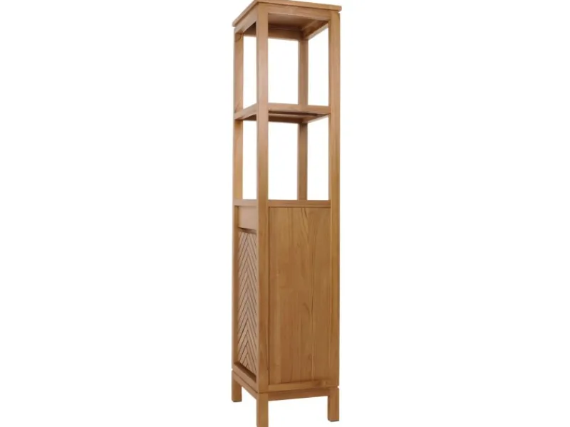 Entdecken Sie den idealen Aufbewahrungsort für Ihr Badezimmer – unseren Teakholz-Hochschrank in elegantem Design, der Funktionalität und Stil meisterhaft vereint. Dieses unverzichtbare Möbelstück wird ohne Dekoration geliefert, sodass Sie sofort mit der persönlichen Gestaltung beginnen können. Zwei großzügige Staufächer sind mit einer Tür und einem praktischen Einlegeboden ausgestattet, was Ihnen ermöglicht, Handtücher, Pflegeprodukte und weitere Badezimmerutensilien ordentlich und griffbereit zu verstauen.