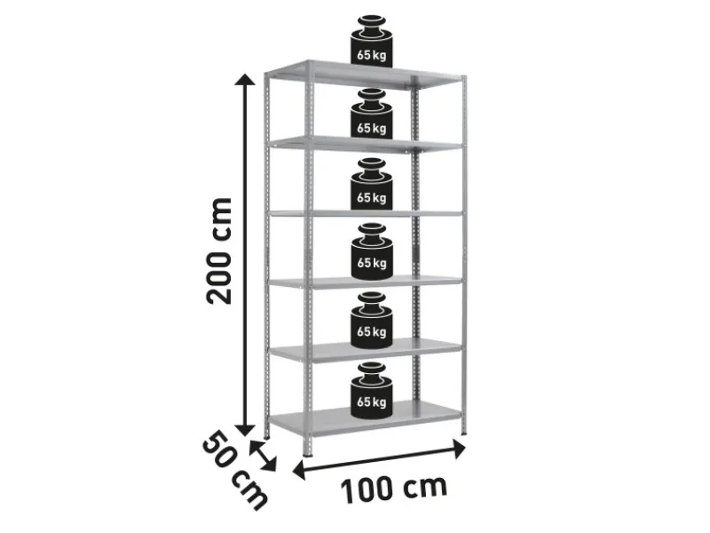 Die sechs Regalböden sind beidseitig zugänglich und in gleichmäßigen Abständen angeordnet. Sie bieten viel Stauraum und können bei gleichmäßiger Gewichtsverteilung mit einer Tragkraft von jeweils 65 kg belastet werden. Insgesamt beträgt die maximale Gesamtlast des Metallregal 390 kg. Die Schraubmontage ist einfach und komfortabel.