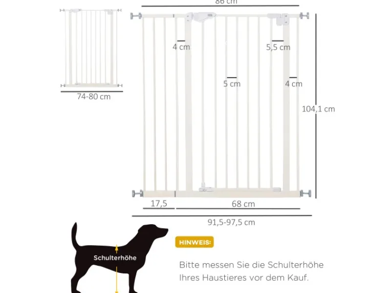 Sorgen Sie für Ruhe und Ordnung in Ihrem Zuhause mit dem Hundetürgitter von Pawhut! Dieses robuste, bleifreie Metallgitter bietet Ihnen die perfekte Lösung, um Ihre Vierbeiner sicher in bestimmten Bereichen zu halten. Dank des doppelt verriegelten Mechanismus bleiben Ihre Lieblinge genau dort, wo Sie sie haben möchten. Besonders praktisch: Die Tür schließt sich automatisch und sorgt für zusätzlichen Komfort. Ideal für alle, die ein harmonisches Zusammenleben mit ihren Vierbeinern schätzen!