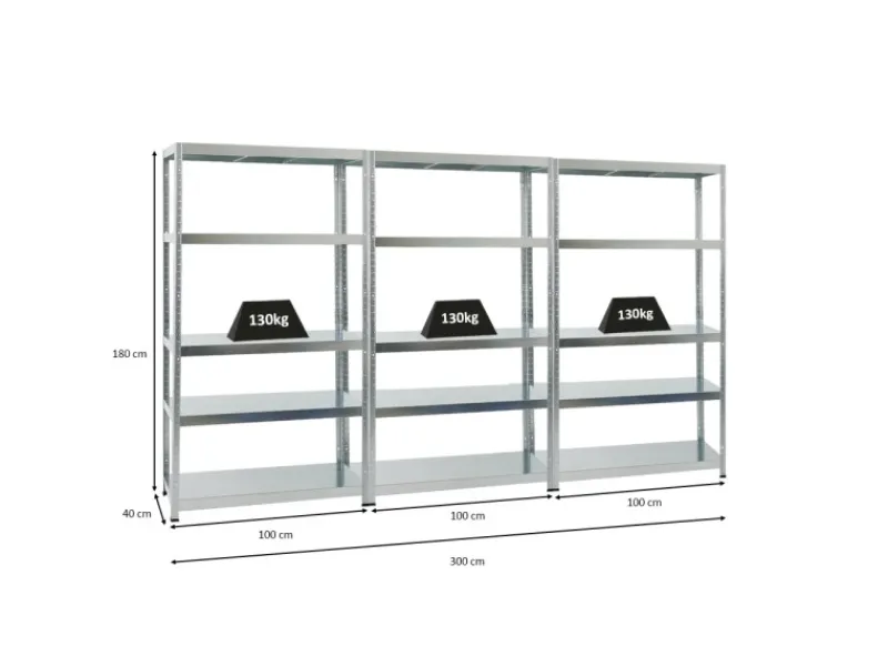 Jedes Schwerlastregal ist 180 cm hoch, 100 cm breit und 40 cm tief. Die Farbe ist Verzinkt