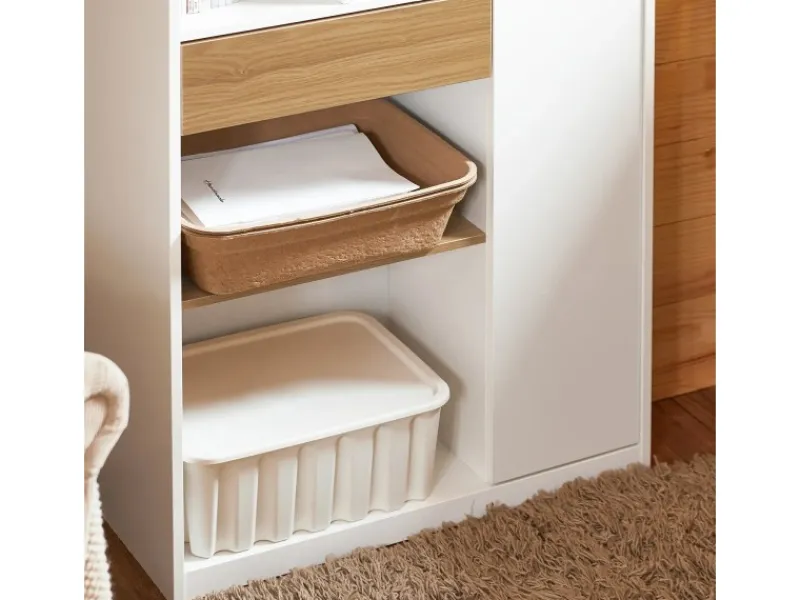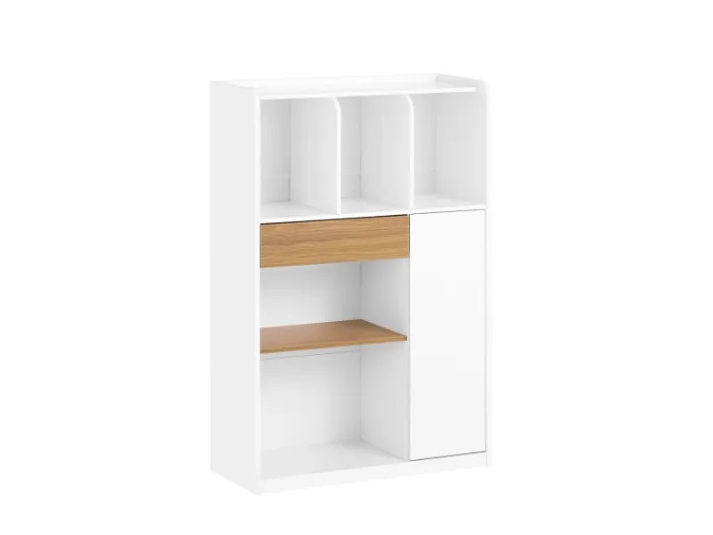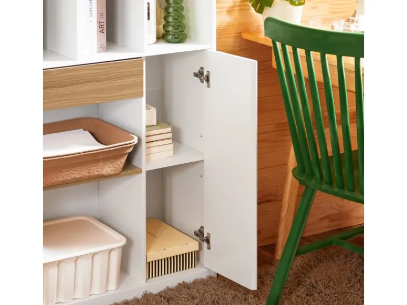 Das moderne Design mit weißen Oberflächen und akzentuierenden Holzelementen verleiht dem Regal einen frischen und eleganten Look, der sich nahtlos in jede Umgebung einfügt.