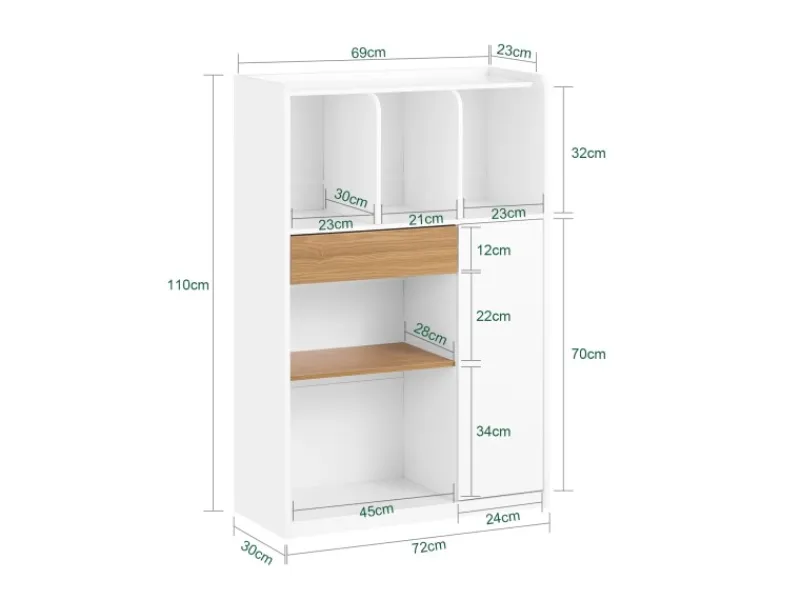 Mit den Maßen 72 x 110 x 30 cm ist das Regal platzsparend und passt in die meisten Räume.