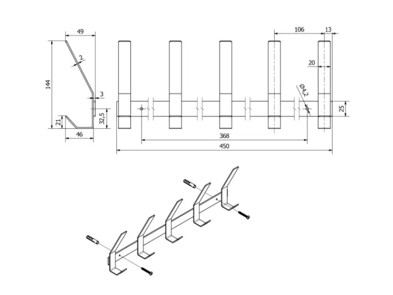 Die Hakenleiste hat eine Länge von 450 mm, was sie ideal macht, um sie in verschiedenen Räumen anzubringen, sei es im Eingangsbereich, im Büro, im Badezimmer, in der Küche oder im Schlafzimmer. Dank ihrer kompakten Größe fügt sie sich nahtlos in jede Einrichtung ein, ohne dabei aufdringlich zu wirken.