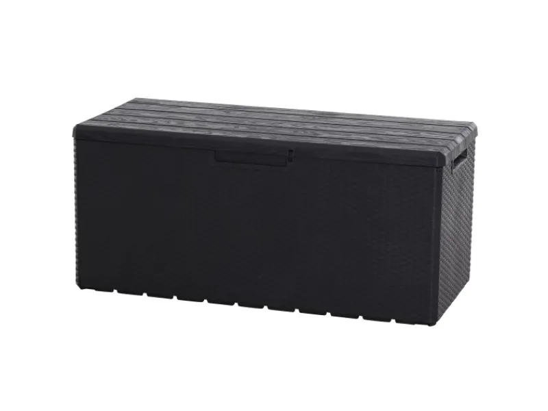 Die Kissenbox verfügt über zwei Griffe für ein einfaches Handling sowie über Rollen für einen einfachen Transport. Zusätzlich bietet sie eine praktische Sitzfunktion für zwei Erwachsene. Die Box ist UV- und witterungsbeständig und mit insgesamt vier Rollen ausgestattet.