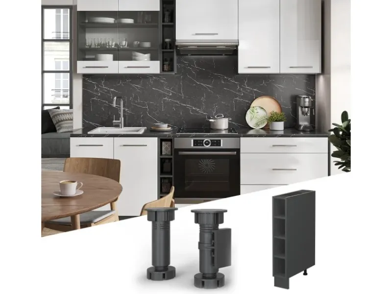 Das Küchenmöbel besteht aus pflegeleichter Spanplatte 16 mm, mit einer Melaminharzbeschichtung