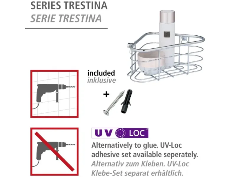 Alternativ kann die Wenko Eckablage Trestina auch stressfrei ohne Bohren befestigt werden – das gelingt Ihnen in Minutenschnelle mit dem innovativen UV-Loc® Klebesystem von Wenko. Mittels Spezialkleber und UV-Lampe bekommen Sie das Bad-Accessoire in nur 60 Sekunden an die Wand. Diese Weltneuheit gewährleistet eine schnelle und saubere Anbringung mit extrem festem und zuverlässigem Halt auf allen tragfähigen Flächen. Das UV-Loc®-Befestigungsset ist separat erhältlich.