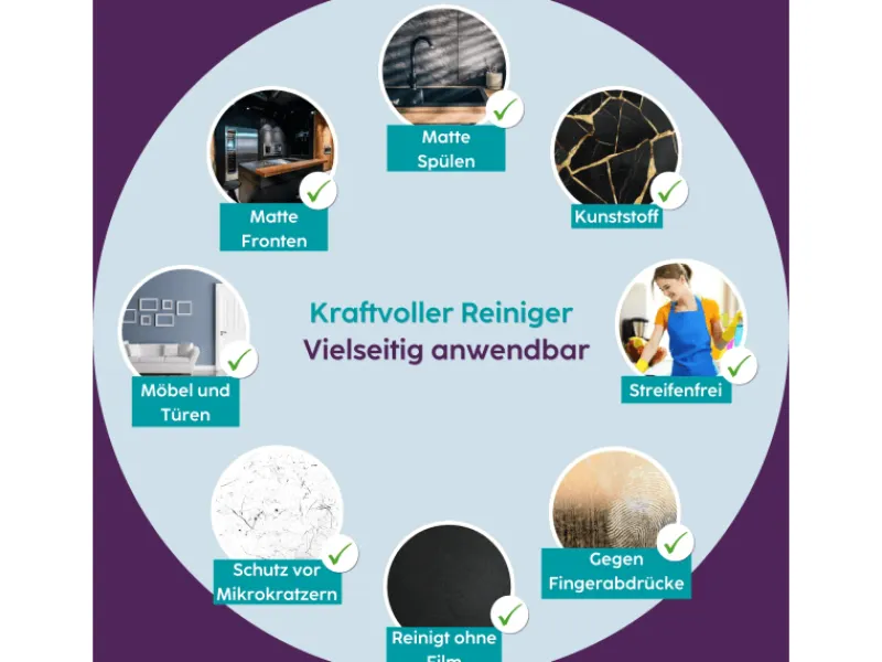 Ideal geeignet für matte Küchenfronten und -möbel. Ebenso einsetzbar für matte Oberflächen im Wohn- und Badbereich.