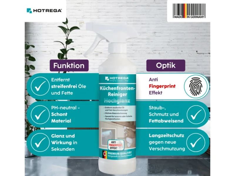 Küchenfronten-Reiniger: Sorgt für streifenfreie Sauberkeit auf glänzenden Fronten, Glanz und Wirkung in Sekunden.