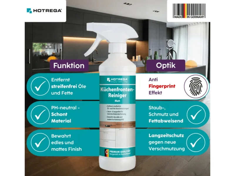 Küchenfronten-Reiniger: Sorgt für streifenfreie Sauberkeit auf matten Fronten, ohne Glanzfilm oder Schichtbildung.