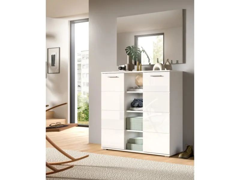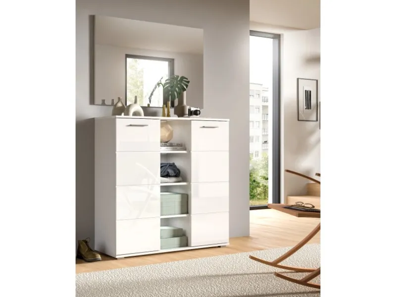 Das kompakte Garderoben Set „Grazie“ in weiß Hochglanz (110 x 191 cm) ist die optimale Ergänzung für Ihr Zuhause. Die 2-teilige Garderobenkombination begeistert mit einem Schuhschrank sowie einem Garderobenspiegel. Sie ergänzt Ihr persönliches Einrichtungskonzept durch das moderne, geschmackvolle Design. Das Modell „Grazie“ ist dank seiner zehn Fächer äußerst nützlich. Es besteht aus unempfindlichem und besonders strapazierfähigem Material und begeistert so mit einer sehr hohen Qualität. Vier Einlegeböden bieten sich zum Verstauen von Bekleidung und Schuhen an. Die Garderobe ist mit zwei Türen ausgestattet, hinter welchen sich Ihnen Platz zum Verstauen Ihrer Ausgehkleidung bietet, kann in weiteren Größenausführungen ausgewählt werden . Die Garderobenkombination in hochglänzendem Weiß (Möbelfronten) und im Dekor Weiß (Korpusse) nimmt 110 x 191 x 37 Zentimeter ein. Sie werden von diesem 2-teiligen Garderoben Set aus dem Hause Inn.Furn begeistert sein.