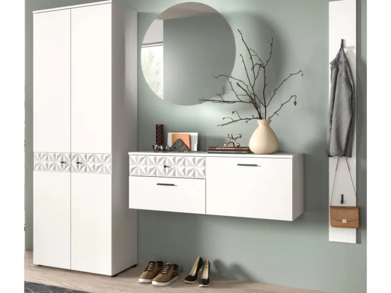 Enthält Garderobenschrank mit Kleiderstange, Spiegelschrank, Schuhschrank und Garderobenleiste