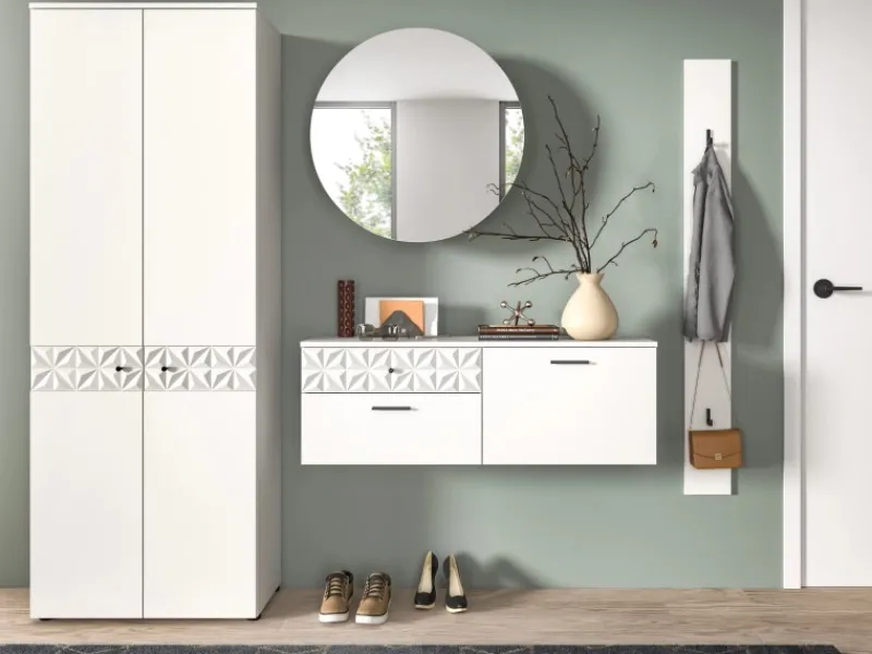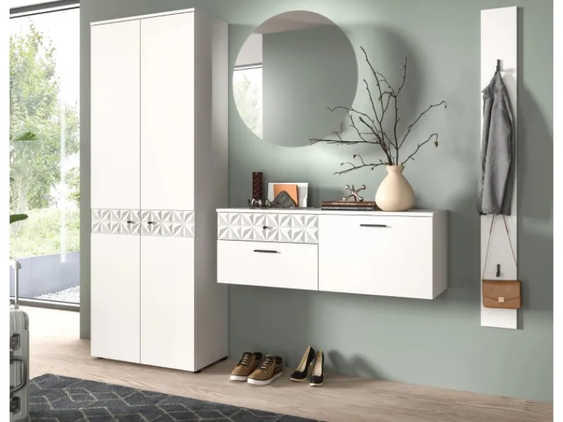 Das elegante Garderoben Set „Relief“ bietet mit einem Garderobenschrank, einem Spiegelschrank, einem Schuhschrank und einer Garderobenleiste vielseitige Aufbewahrungsmöglichkeiten. Mit elf geschlossenen Fächern, einer ausziehbaren Kleiderstange, zwei Schubkästen und vier Haken bietet „Relief“ ausreichend Platz.