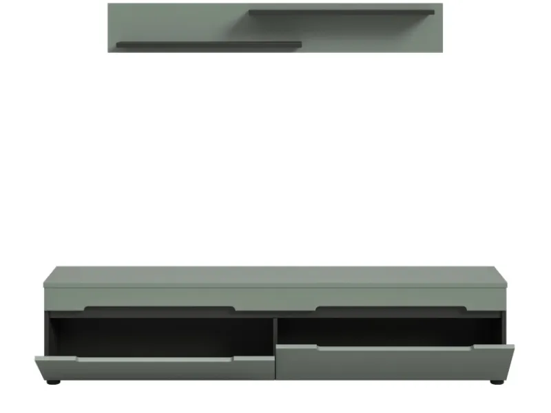 Die 2-teilige Wohnkombination Cooper überzeugt durch modernes Design und praktische Funktionalität. Front und Oberboden in Salbei Grün Melamin harmonieren perfekt mit dem Korpus in Basalt Grau. Das Set besteht aus einem TV-Lowboard und einem Wandboard mit zwei Regalböden und verdeckter Wandbefestigung. Maße gesamt ca. 170 x 180 x 33 cm. Das Lowboard mit zwei Klappen bietet viel Stauraum und kann hängend oder stehend montiert werden.