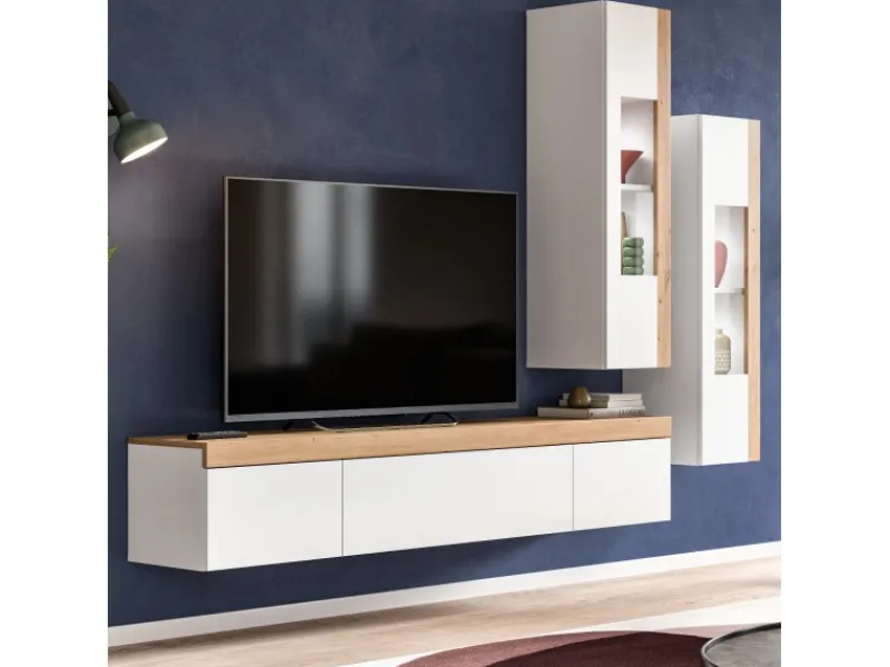 Moderne Wohnwand in Weiß, Artisan Eiche – stilvolle Kombination mit Vitrinen und TV-Lowboard.