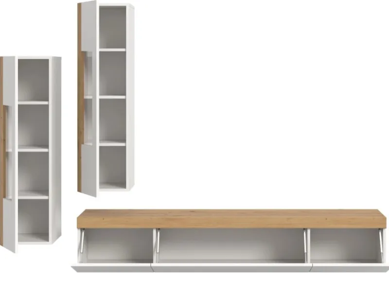 Entdecken Sie die elegante Wohnwand „Siena“, die sowohl hängend als auch stehend montiert werden kann. Diese 3-teilige Kombination besteht aus zwei stilvollen Vitrinen und einem praktischen TV-Lowboard, die frei platziert und arrangiert werden können. Die Front und der Korpus in strahlendem Weiß harmonieren perfekt mit den Absetzungen in Artisan Eiche Dekor. Die Klappen sind mit modernen Gasdruckdämpfern ausgestattet, die ein sanftes Öffnen und Schließen ermöglichen (Soft-Close). Zudem sind die Türen und Klappen grifflos designt mit Push-to-Open Funktion, was für ein minimalistisches Erscheinungsbild sorgt. Mit vier Vitrinenfächern und sieben geschlossenen Fächern erfüllt sie alle Anforderungen an Stauraum und Präsentation.
