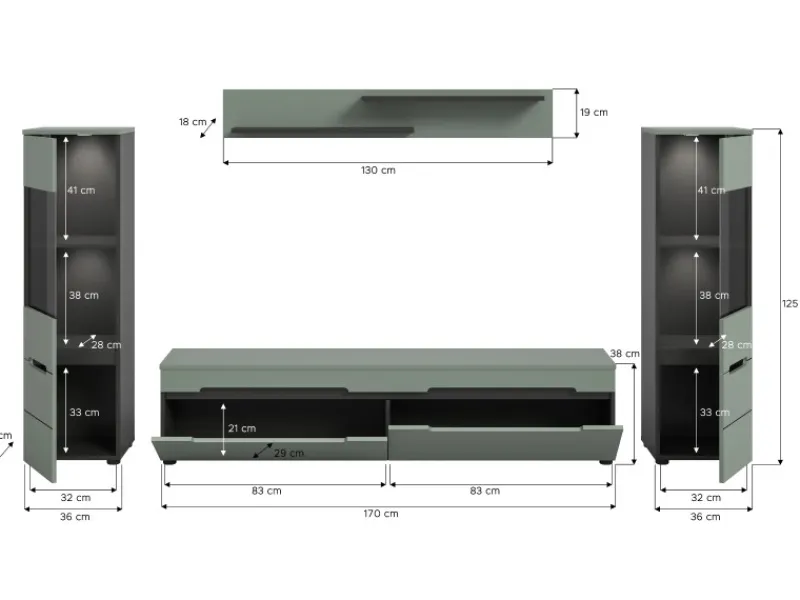 Die Wohnwand „Cooper“ verbindet Design und Ordnung für Ihr Wohnzimmer. Front und Oberboden in Salbei Grün mit basaltgrauem Korpus und Absetzungen setzen moderne Akzente; grifflose Fronten betonen die klare Linie. Flexibel hängend oder stehend montierbar. Das 4-teilige Set aus zwei Vitrinen mit Soft-Close-Funktion, Wandboard und TV‑Lowboard bietet mit vier Vitrinenfächern, vier geschlossenen Fächern und zwei Regalböden Stauraum. Die Farbkombination sorgt für ein harmonisches Ambiente und passt zu vielen Wohnstilen. Kompakte Maße: 272 x 141 x 33 cm.
