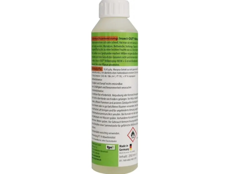Die fertige Sprühlösung wirkt sofort und riecht angenehm. Milben mögen weder den bitteren Geschmack des Neemölextrakts noch den Geruch von Geraniol und werden dadurch abgewehrt. Die Anwendung ist einfach.