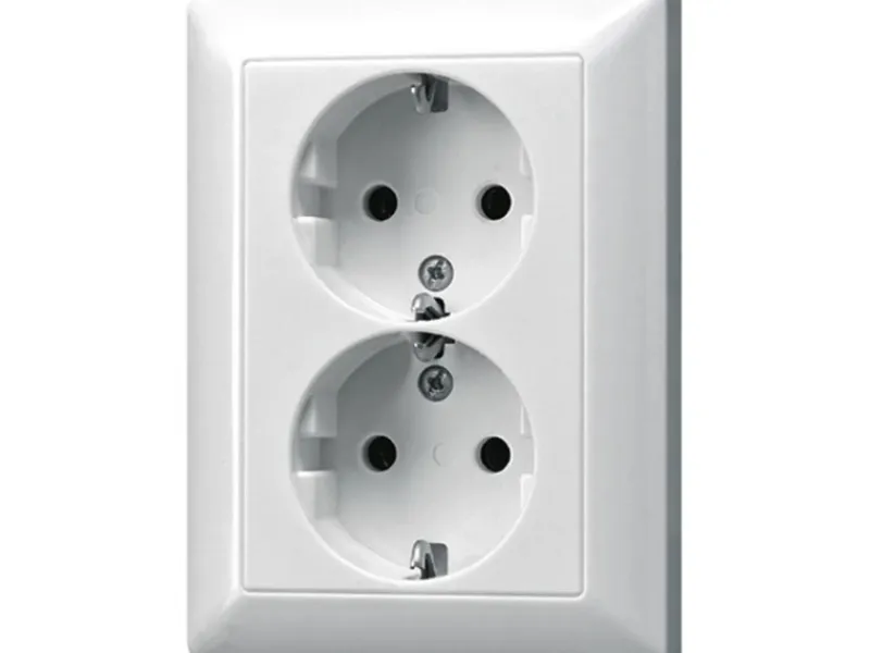 Die Jung Doppelsteckdose aus Duroplast (hochkratzfest) glänzend ist für eine 60er Gerätedose. Sie ist mit Federklemmen und für starre Leiter bis 2,5 mm². Verbindungsklemmen nach DIN VDE 0620 ohne Befestigungskralle. Tragring, Krallen und Krallenschrauben