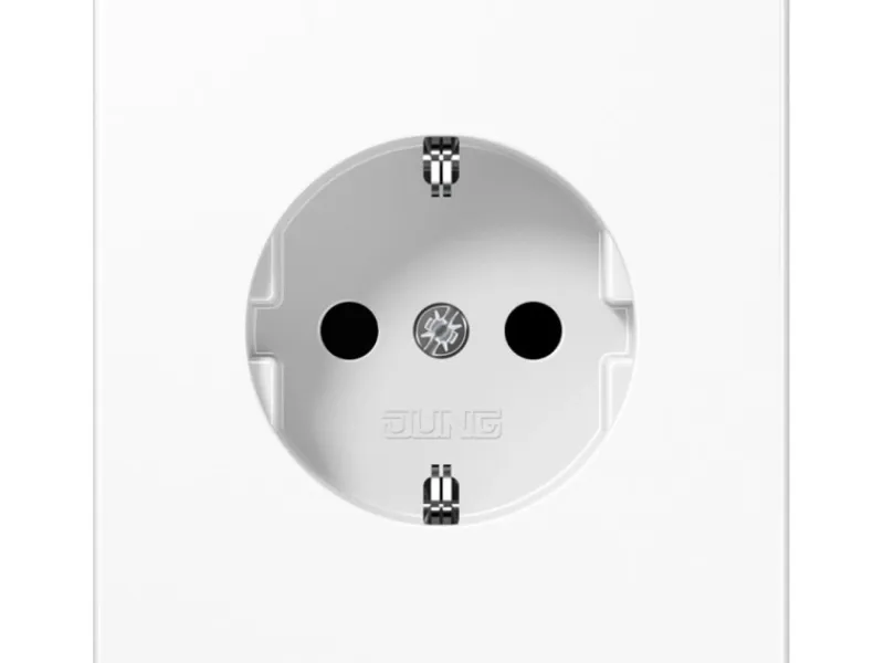 Der Jung Steckdoseneinsatz aus Duroplast (hochkratzfest) glänzend mit Federklemmen ist für starre und unbehandelte flexible Leiter bis 2,5 mm². Verbindungsklemmen nach DIN VDE 0620 ohne Befestigungskralle. Tragring, Krallen und Krallenschrauben sind über