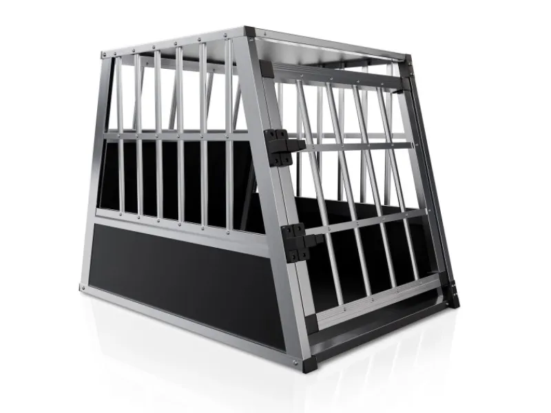 Die rostfreie Reisebox ist aus furnierten MDF-Holzplatten und Aluminiumgitter gefertigt. Diese Kombination sichert erstklassige Stabilität und eine lange Lebensdauer. Zugleich können Sie sie dank des geringen Gewichts ohne Anstrengung aus dem Kofferraum heben. Die Tür lässt sich mithilfe eines Schlosses sicher verschließen.