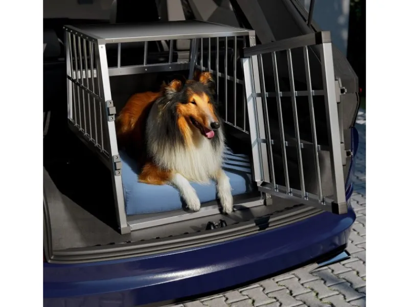 Dank des trapezförmigen Aufbaus passt die Transportbox in den Kofferraum oder auch auf die Rückbank vieler gängiger PKW-Modelle. Sie ist 69 cm hoch, besitzt eine Bodenfläche von 65 × 91 cm und lässt sich schnell im Auto befestigen. Flecken können mühelos mit einem feuchten Tuch von der Gitterbox entfernen werden.