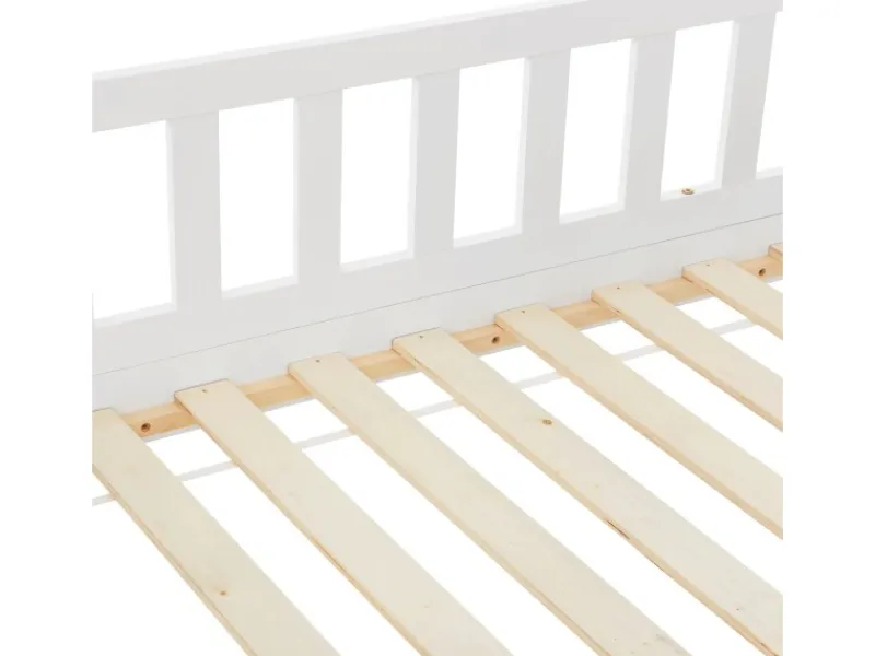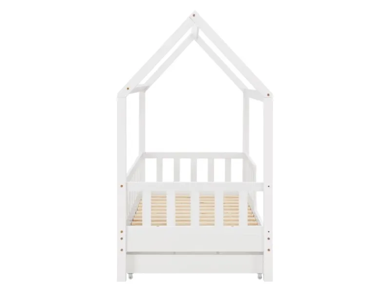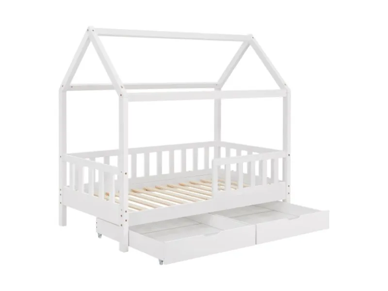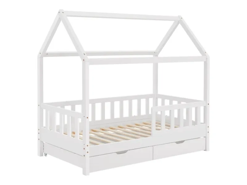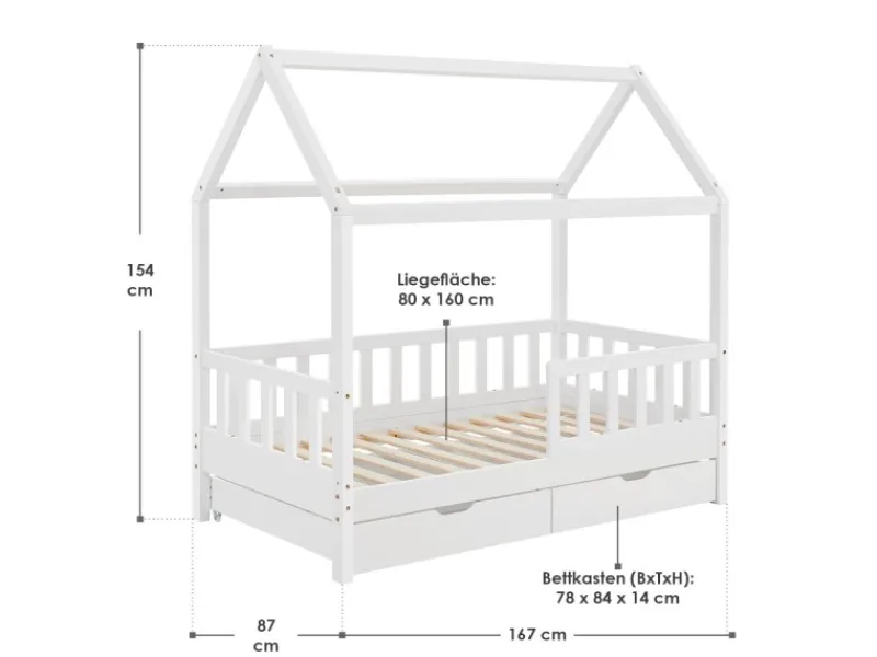 Kinderhausbett mit Dach & Stauraum unter dem Bett Das Kinderbett Marli (160×80 cm, Weiß) mit Bettkasten, Rausfallschutz und Lattenrost überzeugt Mädchen und Jungen von 3 bis 10 Jahren. Verschönern Sie das Kinderzimmer mit dem modernen Hausbett, das Schlafplatz, Spielbett und Stauraum in einem ist. Spielzeug & Co. verstauen Sie ordentlich und platzsparend in dem großen 2-teiligen Bettkasten. Und die Hausoptik mit Dach bietet viele Möglichkeiten zur Gestaltung – als Höhle oder mit bezaubernder Himmeldekoration. Ausgestattet mit einem Gitter, bietet das Bett für junge Kinder zudem mehr Schutz und Sicherheit. Für einen langen Einsatz ist das Holzbett aus massivem und pflegeleichtem Kiefernholz die richtige Wahl. Produktmerkmale: