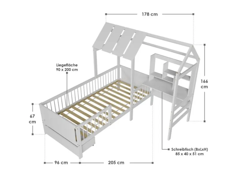 – Dach, Schreibtisch, Geländer am Kopf- und Fußteil: MDF