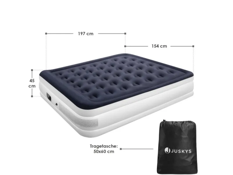 Die integrierte, elektrische Luftpumpe versorgt das Bett automatisch im Handumdrehen mit ausreichend Luft. Lästiges Aufblasen mit der Hand gehört so der Vergangenheit an. Angeschlossen wird die Luftpumpe mit einem handelsüblichen Euro-Stecker.