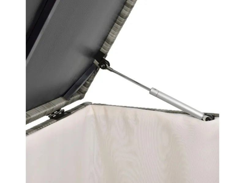 Als Gartenmöbel ist die praktische Kissenbox mit Klappdeckel verschließbar. Dadurch sind Gartenutensilien praktisch verstaut. Die Hubautomatik (2 x Dämpfer) am Deckel erlaubt ein sicheres Auf- und Zumachen der Kiste. Das bietet Sicherheit, damit der Deckel nicht ruckartig schließt.