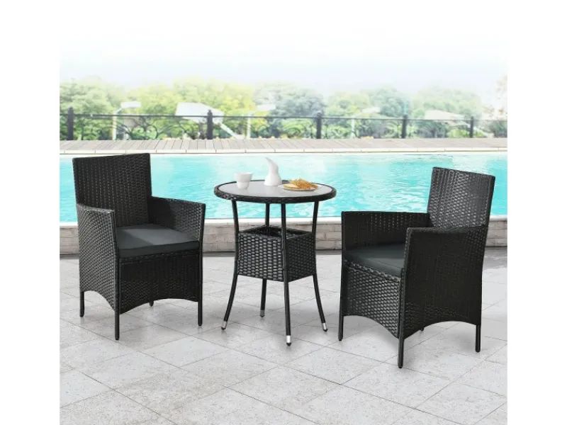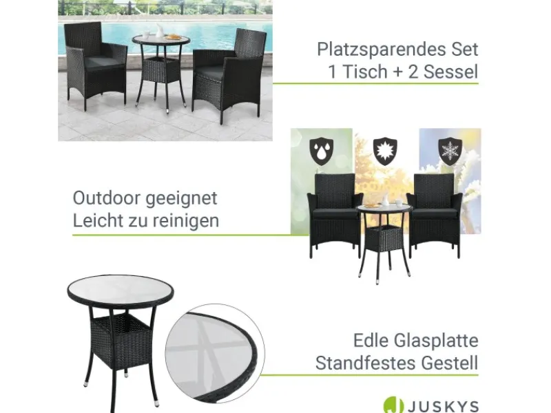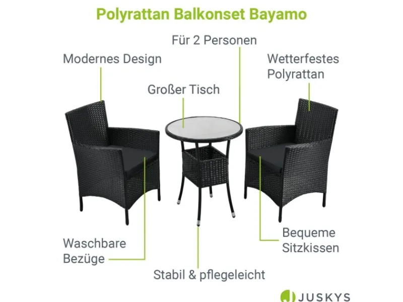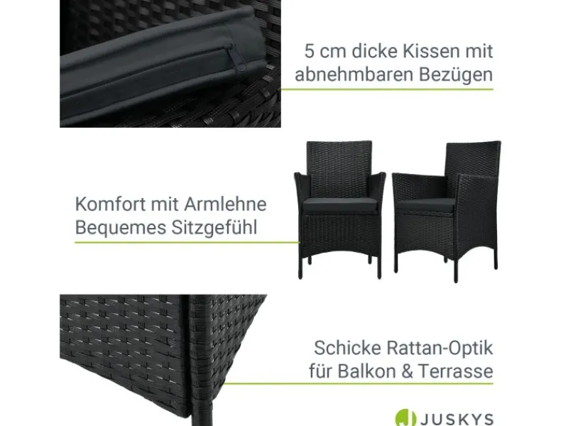 Die 3-teilige Sitzgruppe bestehend aus einem stabilem Tisch und 2 Loungesesseln eignet sich perfekt als platzsparendes Balkonset für 2 Personen. Werten Sie mit den modernen Gartenmöbeln Ihren heimischen Balkon auf und schaffen sich eine eigene kleine Wohlfühloase für unvergessliche Sommermomente.