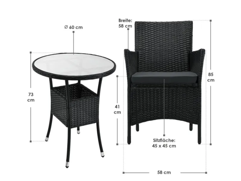 Inklusive ist ein 60 cm breiter Tisch mit einer schicken Glasplatte. Dieser bietet genügend Platz für ein gemeinsames Sonntagsfrühstück oder Cocktails am Abend. Die zugehörige Glasplatte ergänzt sich perfekt mit der geflochtenen Rattan-Optik. Das hochwertige Material sorgt zusammen mit den Querstreben für eine hohe Standfestigkeit.