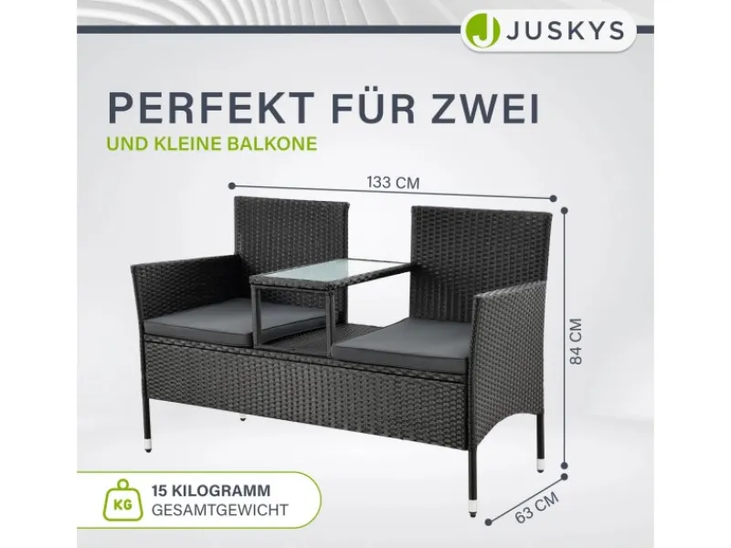 Ausgestattet mit weichen Polstern sowie hohen Arm- und Rückenlehnen bietet die Sitzgarnitur einen perfekten Komfort. Zwischen den zwei Plätzen befindet sich ein kleiner Abstelltisch mit einer 5 mm stabilen Glasplatte. Hier platzieren Sie ein kühles Getränk an einem warmen Sommertag.