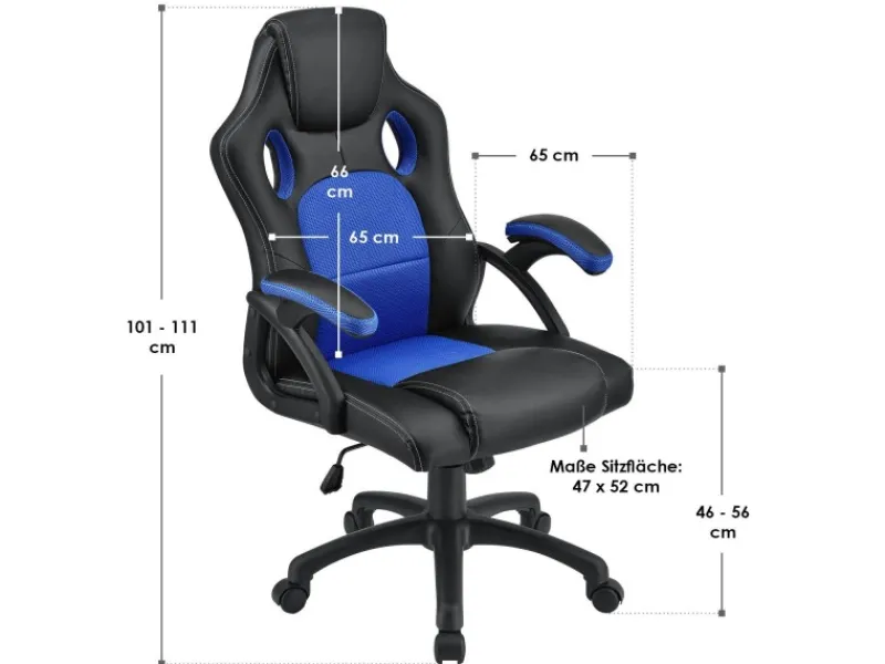 Die Sitzfläche lässt sich mit der Gasdruckfeder stufenlos in der Höhe zwischen 46 und 56 cm verstellen. Dadurch positionieren Sie den Schreibtischstuhl auf die gewünschte Sitzhöhe. Der Computerstuhl ist um 360° frei drehbar. Dies gewährt größtmögliche Bewegungsfreiheit.