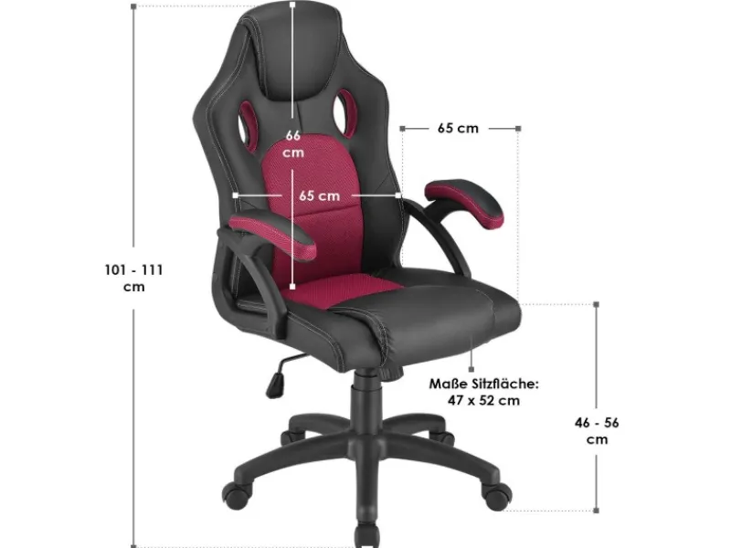 Per Gasdruckfeder stufenlos höhenverstellbar (46–56 cm). Der Drehstuhl ist 360° drehbar und bietet große Bewegungsfreiheit.