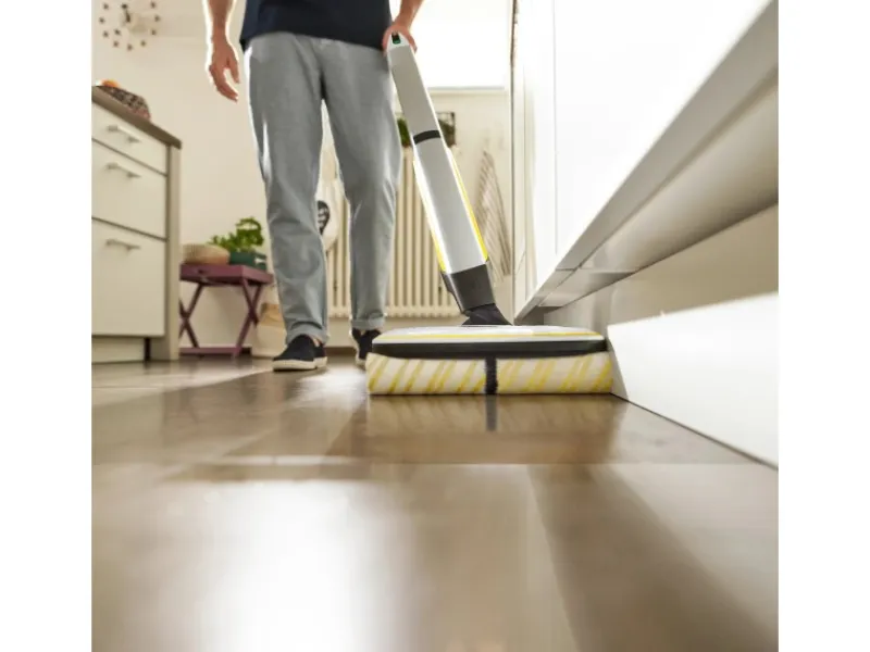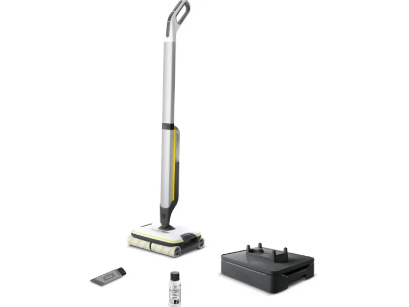 Der FC 7 kann von selbst stehen, sodass du auch kurze Pausen einlegen kannst. Dank des flexiblen Gelenks gelingt auch das Wischen unter Möbeln mühelos. Die praktische Reinigungsstation erleichtert dir die Entnahme und Trocknung der Walzen und bietet zudem eine praktische Aufbewahrung für Zubehöre. Die Akkus lassen sich austauschen und können auch für andere 4 V Battery Power-Geräte von Kärcher eingesetzt werden.