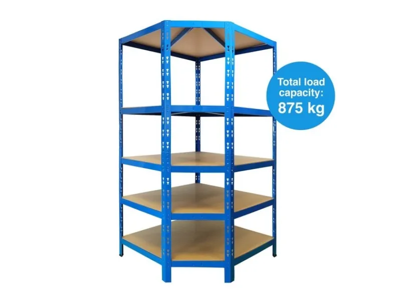 Nutzen Sie jetzt die Ihnen verfügbare Fläche optimal und sicheren Sie sich mit unserem hochbelastbaren Eckregal die perfekte Alternative zu herkömmlichen Schwerlastregalen. Erhältlich in blauer oder verzinkter Ausführung, bietet das Eckregal mit einer Gesamttragkraft von 875 kg reichlich Stauraum für schwere, und durch die fünf enthaltenen Regalböden, auch für große Gegenstände. Mit einem Gewicht von etwa 32 kg behält das Regal dabei einen sicheren Stand und verwahrt gelagertes daher zuverlässig.Das Schwerlastregal ist aufgrund seiner Tragfähigkeit und Stabilität der perfekte Alltagshelfer und eignet sich zum Beispiel zum Aufstellen in Kellern, Garagen und Firmen.