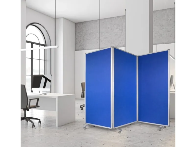 Mobile Filz-Stellwand in verschiedenen AusführungenDie mobile, faltbare Filz-Stellwand besteht aus drei Filz-Pinntafeln und einem robusten Aluminiumrahmen. Die einzelnen Filztafeln sind flexibel verstellbar und lassen sich um 360° drehen. Erhältlich ist die Stellwand mit Filzoberfläche in verschiedenen Farben und Größen. Ob als Präsentationswand oder als Trennwand, mit der mobilen Filz-Stellwand sind Sie bestens ausgerüstet. Präsentationswand mit Filzoberfläche für die perfekte PräsentationDie mobile Filz-Stellwand dient zum einen als Trennwand und Raumteiler in Büroräumen, speziell in Großraumbüros. Andererseits kommt die dreiteilige Stellwand als Präsentationswand zum Einsatz. Ausgestattet mit drei doppelseitig nutzbaren Filz-Pinntafeln und insgesamt 8 Rollen, welche jeweils mit praktischer Feststellbremse ausgerüstet sind, kann die hochwertige Präsentationswand schnell und einfach bewegt und positioniert werden. Darüber hinaus sind die einzelnen Tafeln um 360° drehbar. Das ermöglicht eine flexible und vielseitige Präsentation.Mobile Filz-Stellwand mit robustem AluminiumrahmenDas Gesamterscheinungsbild der mobilen Filz-Stellwand wird durch einen edlen und stabilen Aluminiumrahmen abgerundet. Dieser sorgt für einen sicheren Stand und ermöglicht gleichzeitig ein leichtes Fortbewegen, da Aluminium im Vergleich zu anderen Metallen verhältnismäßig leicht ist.Mobile Filz-Stellwand – Produkteigenschaften:Material: Aluminium, Filz, KunststoffGesamtmaß ausgeklappt (B x H): 180 x 180 cm, 270 x 180 cmMaße je Trenn Element: 60 cm (180 x 180 cm), 90 cm (270 x 180 cm)Nettogewicht: ca. 12,2 kg (180 x 180 cm), 16 kg (270 x 180 cm)Gesamtgewicht: ca. 16 kg (180 x 180 cm), 22,6 kg (270 x 180 cm)Farben: Blau, Grau8 Rollen mit FeststellbremseFilztafel: einteilig und doppelseitig nutzbar, insgesamt 3 FilztafelnFür die Verwendung von Pinnadeln und Reißnägeln geeignet