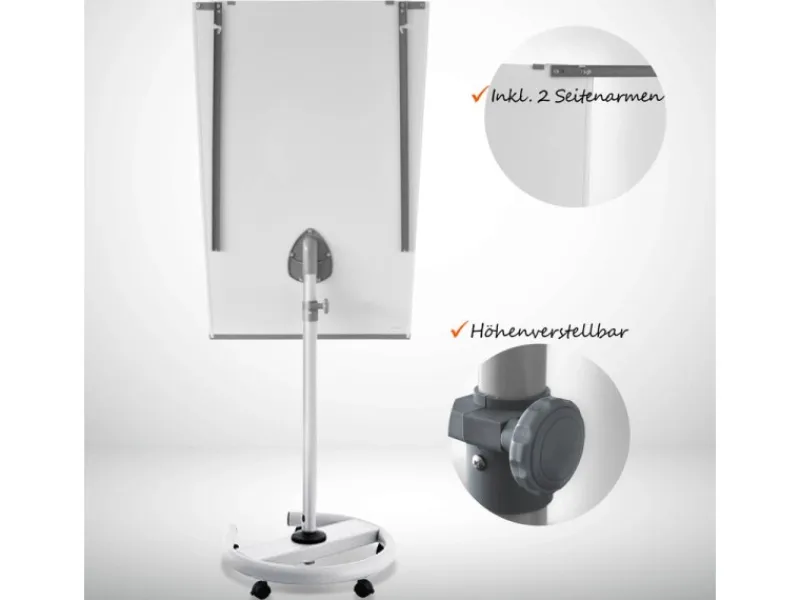 Mobiles Flipchart mit Papierhaltern „Shark“ – mit stabilem RollenfußDas mobile Flipchart mit Papierhaltern „Shark“ von Master of Boards ist ein hochwertiges Präsentationsmedium, das für den professionellen Einsatz in Büros, Besprechungsräumen oder Schulen konzipiert wurde. Die Schreibfläche des Flipcharts ist sowohl magnethaftend als auch beschreibbar. Somit lässt sich das Flipchart nicht nur mit, sondern auch ohne Papier als kompaktes, mobiles Whiteboard nutzen. Die Papierhalter sorgen für zusätzliche Präsentationsfläche und ermöglichen eine übersichtlichere Darstellung.Dank des stabilen Rollenfußes kann das Flipchart leicht manövriert werden. Die Rollen sind feststellbar, sodass das Stativ während des Arbeitens nicht unbeabsichtigt verschoben werden kann. Die Schnellwechsel-Halterung für Flipchart-Blöcke – individuell auf jeden Lochabstand einstellbar – ermöglicht ein schnelles und einfaches Tauschen der Papierblöcke. Die Ablageschale an der Unterseite der Tafel bietet Stiften eine Ablagemöglichkeit und sorgt dafür, dass diese stets griffbereit sind.Mobiles Flipchart mit Papierhaltern – Produkteigenschaften:Marke: KaratTafelformat (BxH): ca. 73×104 cmMaße Schreibfläche: ca. 92×66 cmHöhe Unterkante (eingeschoben/ausgezogen): ca. 73-104 cmStufenlos höhenverstellbar bis ca. 210 cmInkl. 2 PapierhalternMaterial: Metall, KunststoffOberfläche: magnethaftend, beschreibbarSchnellwechselhalterung für Flipchart-BlöckeLochabstand individuell einstellbarGestell / Fuß: Standbein mit Rollenfuß, 5 feststellbare LaufrollenAblageschale für StifteReinigung: trocken oder feucht abwischbar