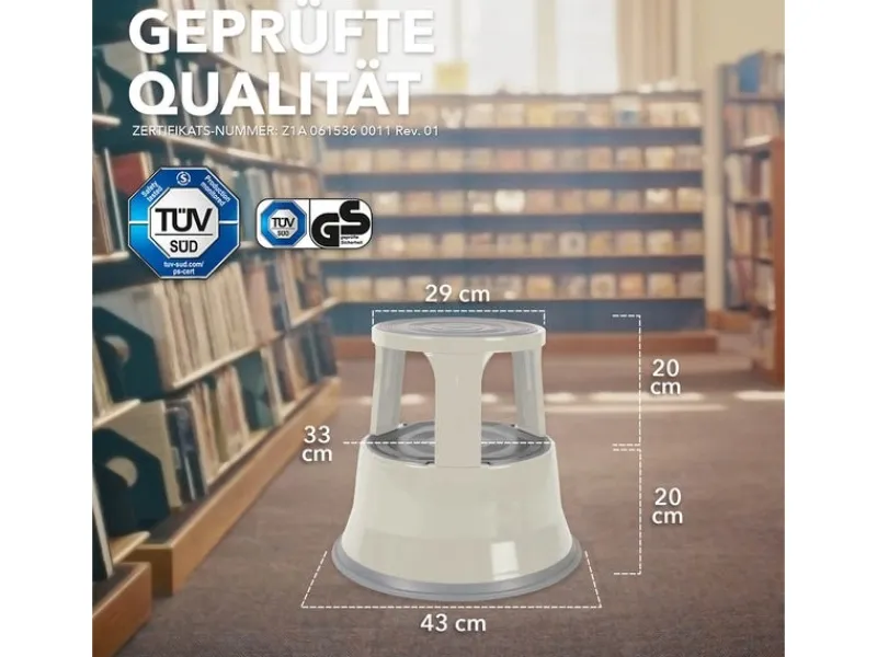 Der ausgesprochen robuste Rollhocker aus Stahl ist ein praktischer Helfer für zu Hause, das Büro oder Ladengeschäfte. Mit ihm gewinnen Sie 40 Zentimeter an Größe, wenn etwas in unerreichbaren Höhen erreicht werden soll. Aus diesem Grund sind Rollhocker auch in praktisch jeder Bücherei, jedem Archiv oder Supermarkt vorzufinden. Neben seiner originären Funktion kann der in drei Farben erhältliche „Elefantenfuß“ auch als Sitzgelegenheit für eine kurze Rast oder als Ablage genutzt werden. Die Sicherheit des Rollhockers wurde durch ein Zertifikat des TÜV Süd bestätigt.