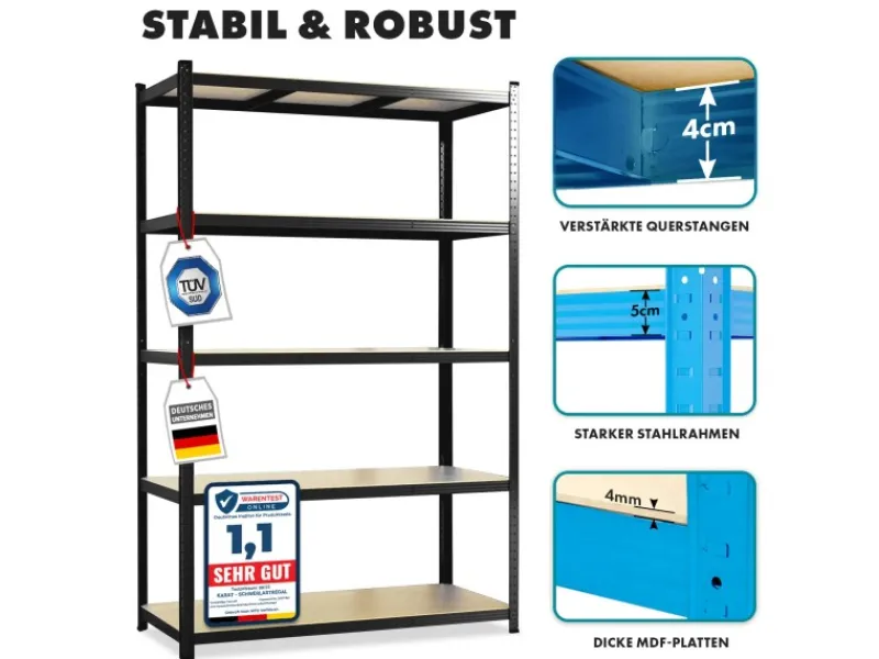 Schwerlastregal mit bis zu 250 kg Tragkraft je Boden und 1250 kg Gesamttraglast. Das Metallregal wird einfach zusammengesteckt und bietet dennoch ein Höchstmaß an Stabilität. Aufgebaut werden kann das Steckregal entweder in voller Höhe mit 5 übereinander angeordneten Böden. Alternativ können auch zwei kleine Regale, eines mit 3, das andere mit 2 Regalböden, zusammengesteckt werden.