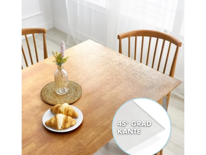 Ein besonderes Highlight des Tischschutzes ist der edel gestaltete Kantenschnitt im eleganten 45-Grad-Design.. Dieser abgeschrägte Kantenschnitt sorgt für eine harmonische und nahtlose Optik, die Ihrem Tisch einen anspruchsvollen Look verleiht und gleichzeitig die Kanten vor Abnutzung schützt.