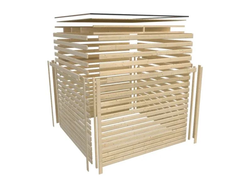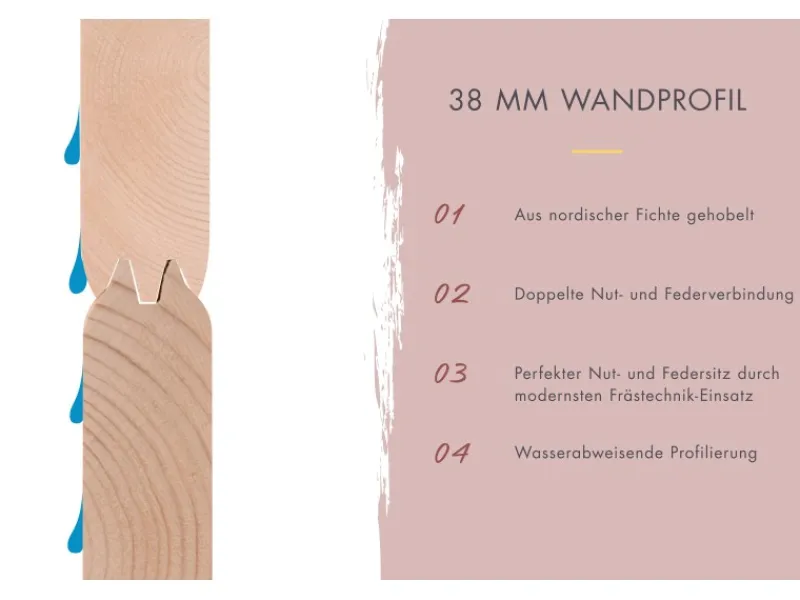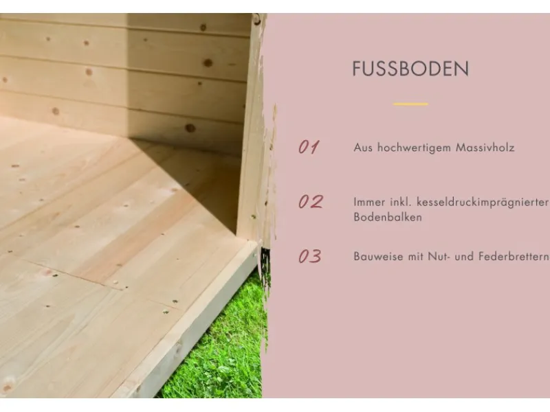 Das formschöne und praktische Dach sorgt für Witterungsschutz von oben. Für den nötigen Abstand zum Erdreich sorgen kesseldruckimprägnierte Bodenbalken. Auf diese werden die Wandbretter sowie die Nut- und Federbretter des Fußbodens montiert.